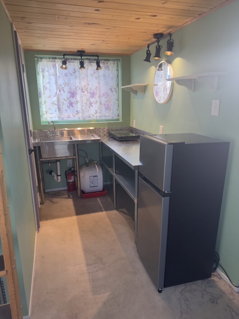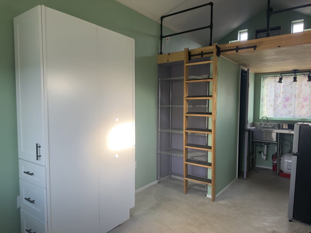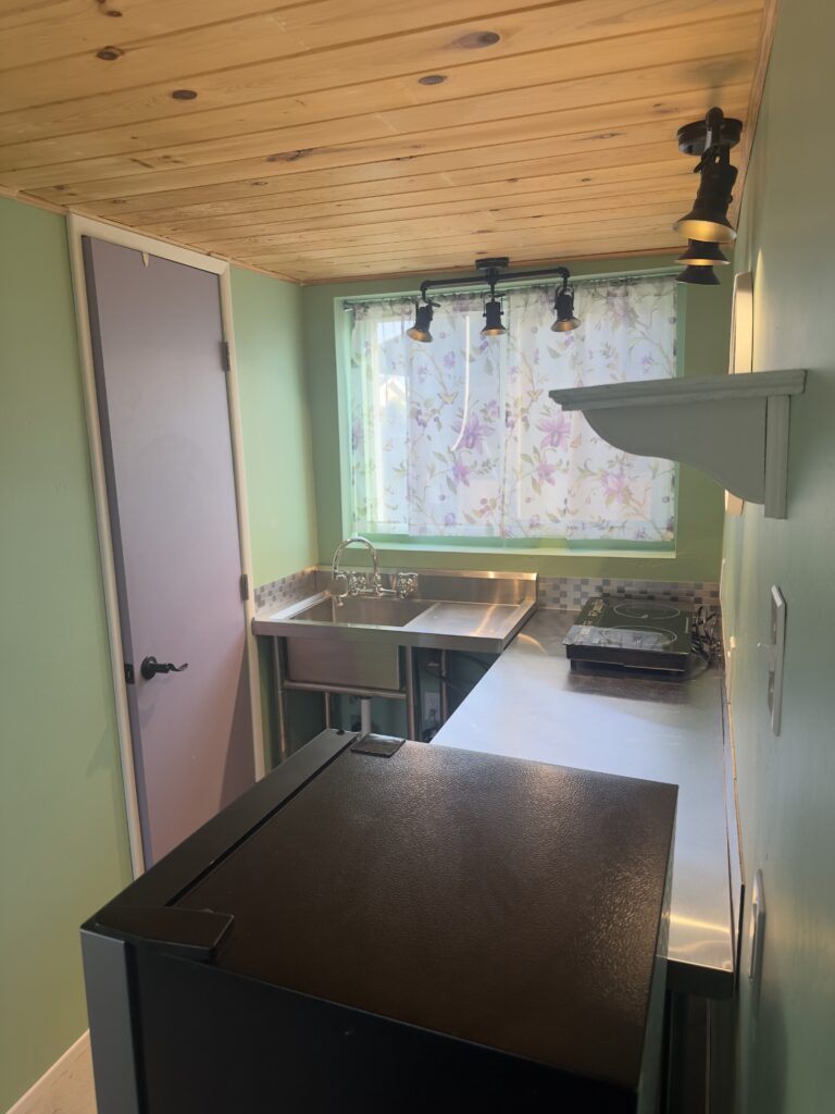 This one of a kind (artistic flair), built for a chemically sensitive/fragrance free person in 2020. The Tiny Home is charming and completely healthy! It has a loft bedroom, kitchenette, living area, and 1 bath. It has a 2 burner induction stove top, small fridge, hot water on demand, and dish drying rack. There are 2 tall cabinets with shelves and drawers for additional storage.