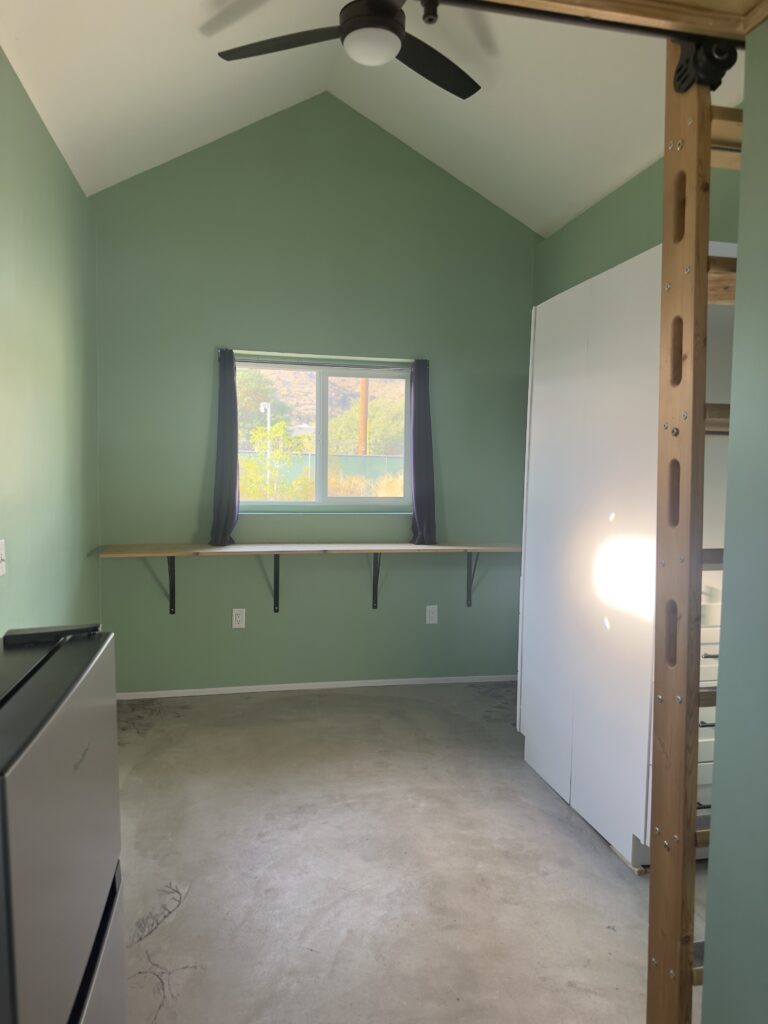 It sits near South Mountain on an acre in Phoenix. Very quiet area. My home is also located on this property and this tiny home is situated on the back of the property. It has a window AC unit built in the loft area. It is heated with a space heater in winter. No plumbing in the walls so no worries about undetected leaks creating mold.