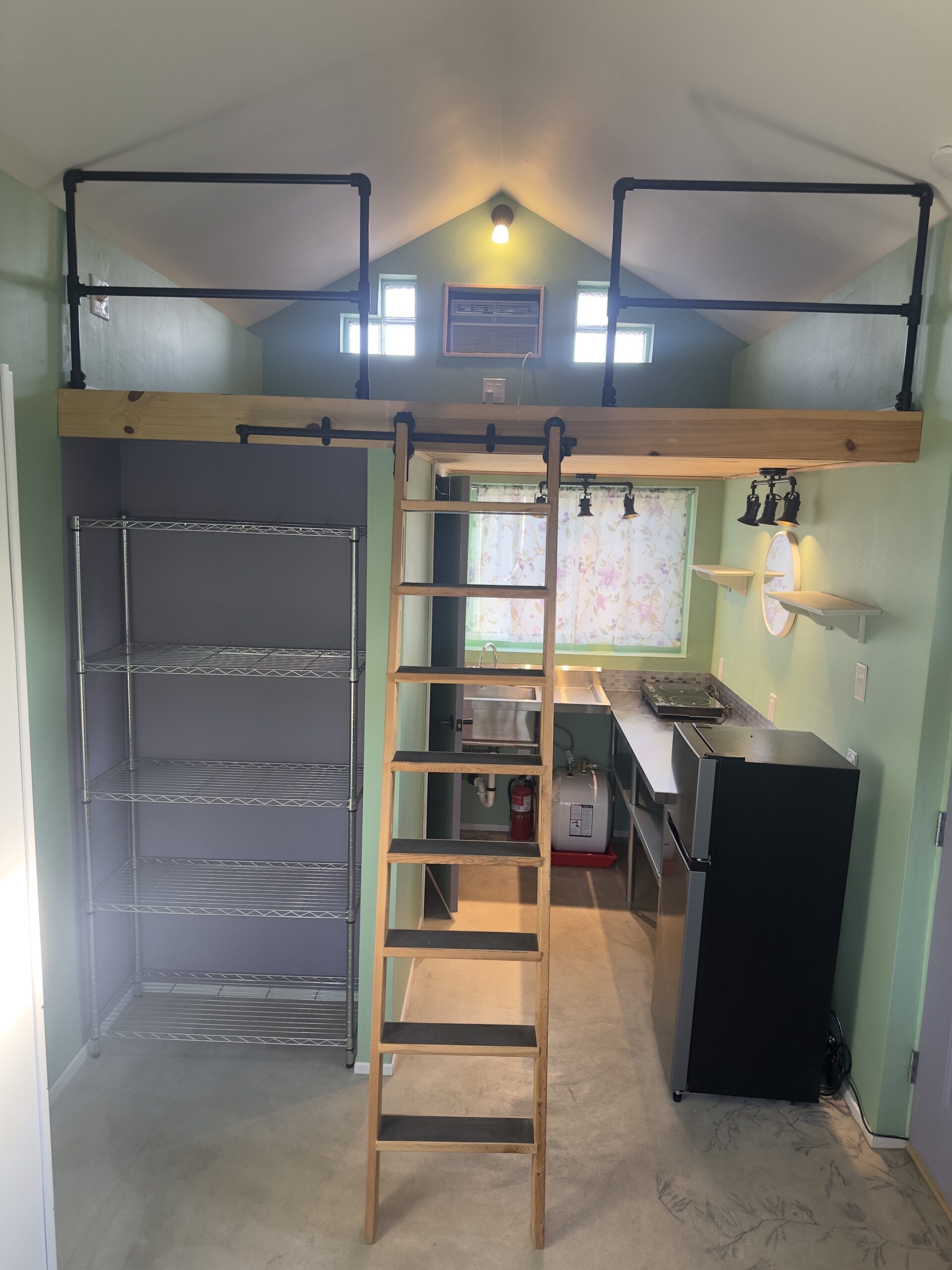 This one of a kind (artistic flair), built for a chemically sensitive/fragrance free person in 2020. The Tiny Home is charming and completely healthy! It has a loft bedroom, kitchenette, living area, and 1 bath. It has a 2 burner induction stove top, small fridge, hot water on demand, and dish drying rack. There are 2 tall cabinets with shelves and drawers for additional storage.