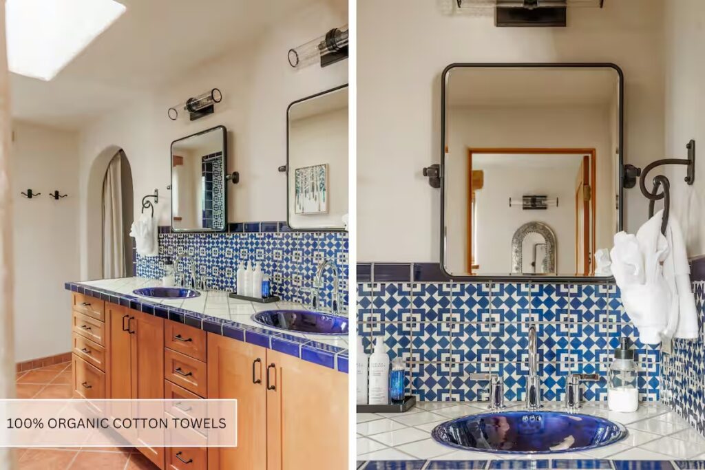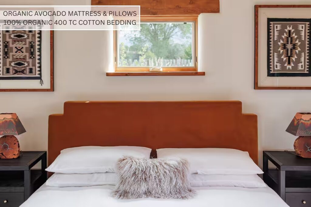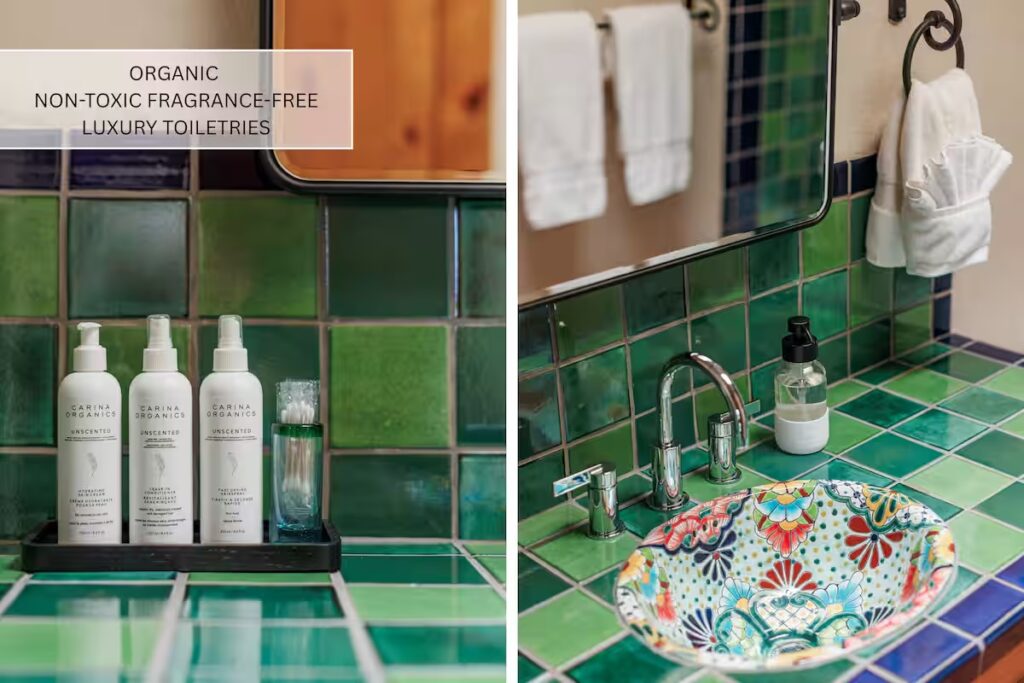 Each bedroom features Avocado organic mattresses and pillows, 100% organic 400-thread-count sheets and bedding, and 100% non-toxic wool carpeting. Rooms are located in separate wings for added privacy and include thoughtful touches such as dimmable lighting, soft seating, full-length mirrors, and ample storage.